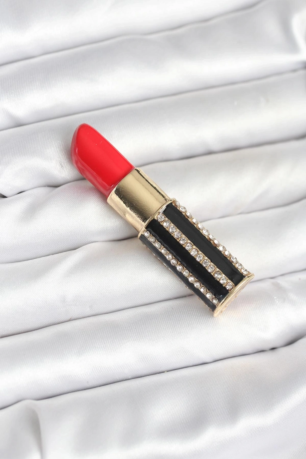 Zirkon Taşlı Kraliçe Taç Detaylı 3D Kırmızı Dudak Figürlü Gold Renk Kadın Broş