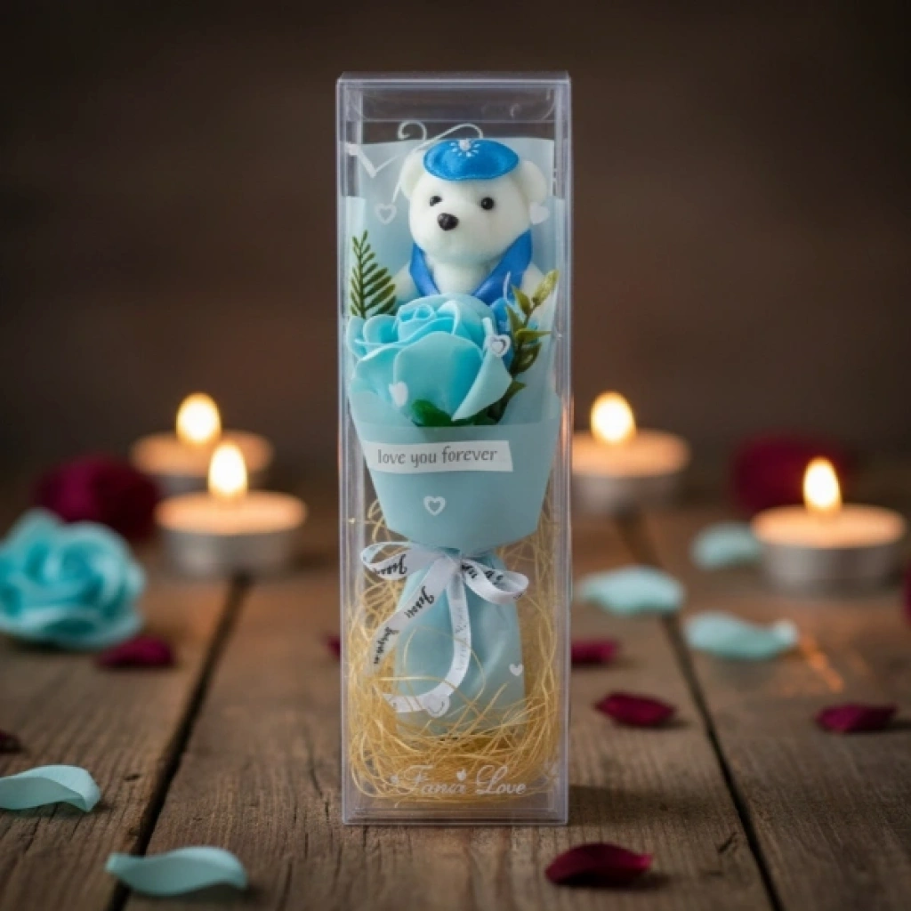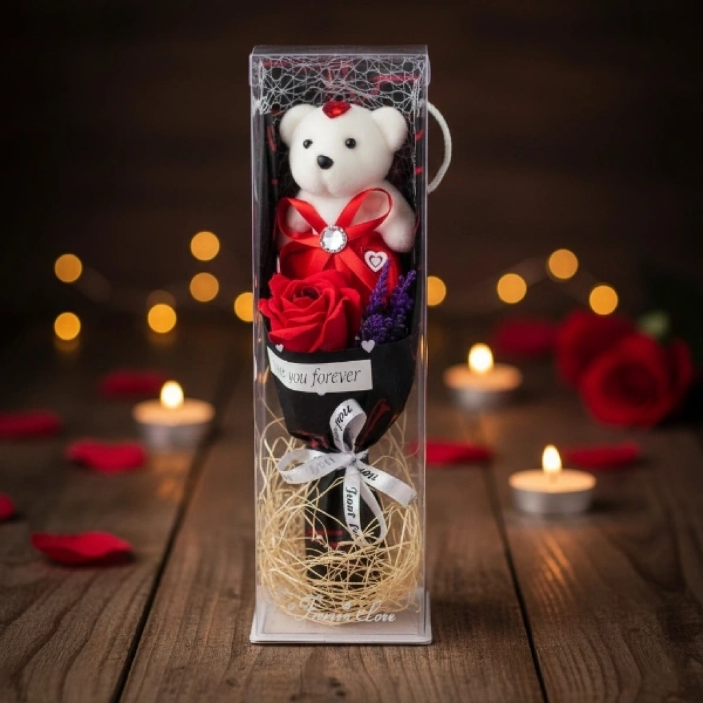 Şeffaf Kutulu Ayıcıklı Gül Buketi