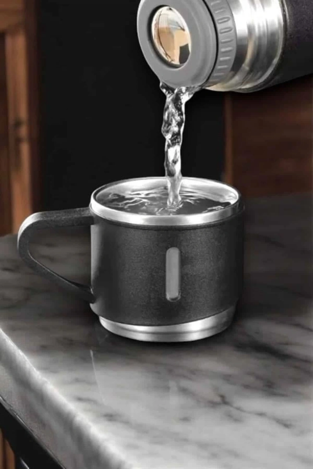 Termos Paslanmaz Çelik Termos Siyah Renk 3 Bardaklı Termos Seti