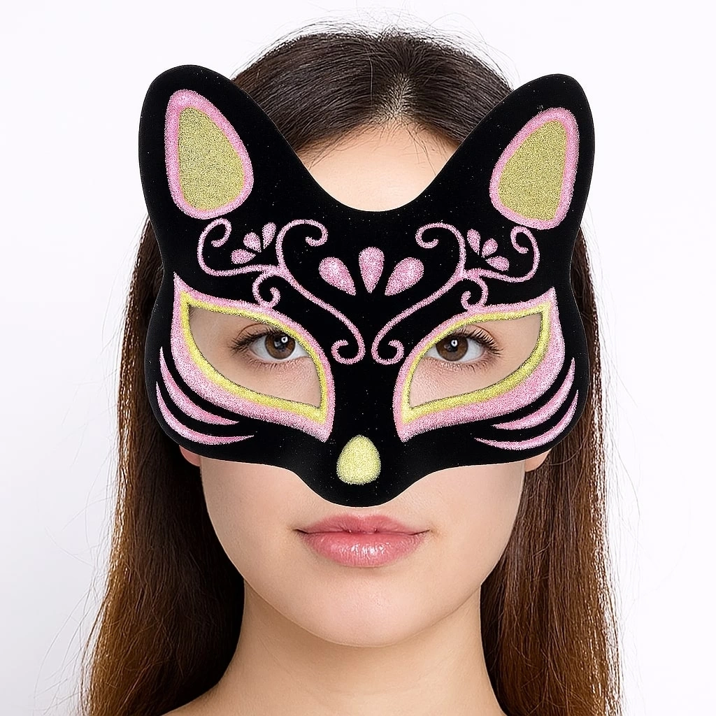 Siyah Renk Süet Kaplama Üzeri Sarı Pembe Simli Kedi Maskesi 17x14 cm
