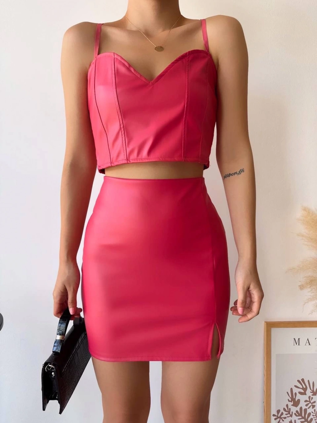 Tek yırtmaçlı arkadan fermuarlı deri etek fuşya s24475