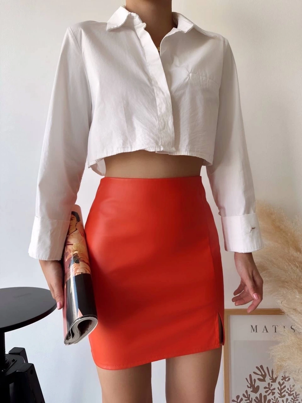 Tek yırtmaçlı arkadan fermuarlı deri etek turuncu s24475