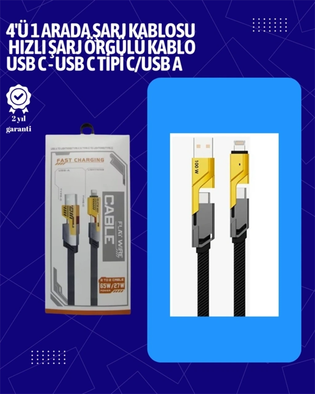 USB-C ve Lightning Uyumlu 4'ü 1 Arada Kablo – 65W Hızlı Şarj, Örgülü Dayanıklı Yapı