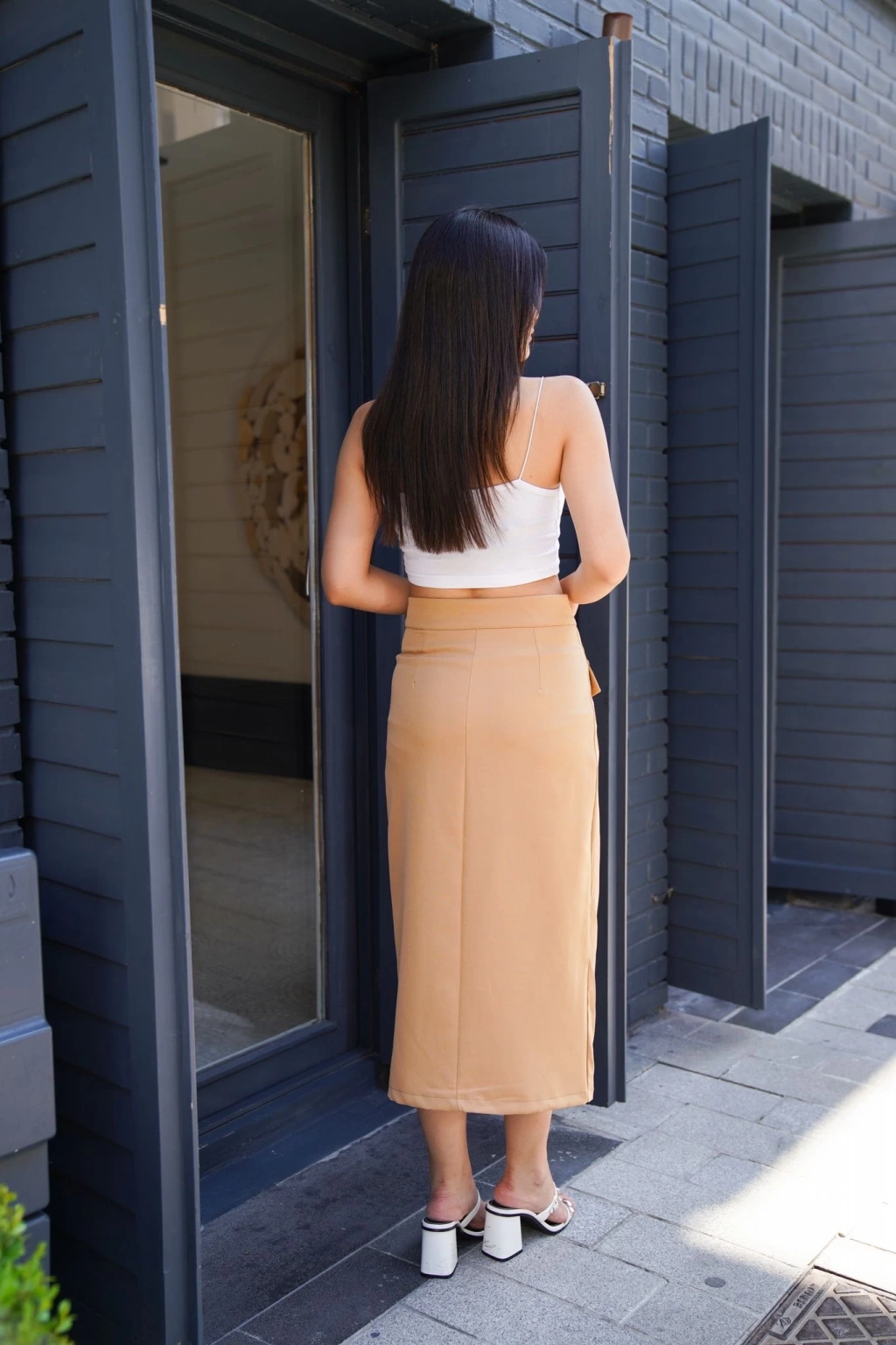 Cep detaylı oval kapaklı deri etek kahve h240048