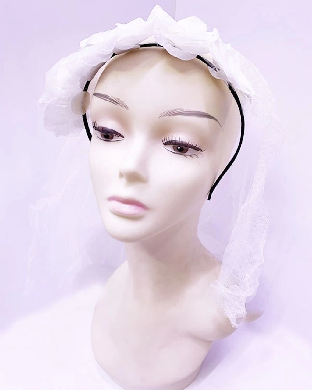 Uzun Duvaklı Üstü Beyaz Çiçekli Parti Tacı