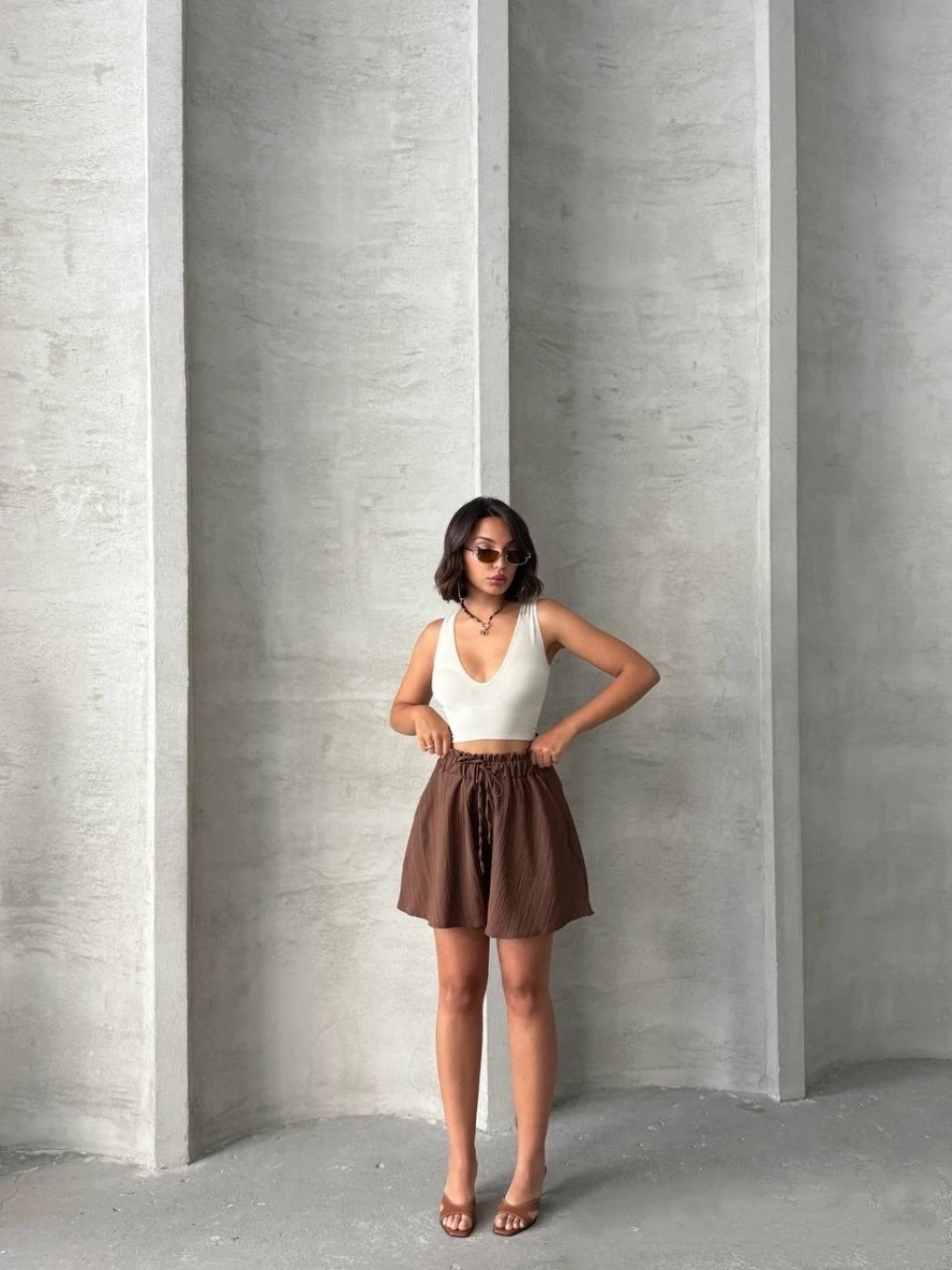 Volanlı keten şort kahve s255058