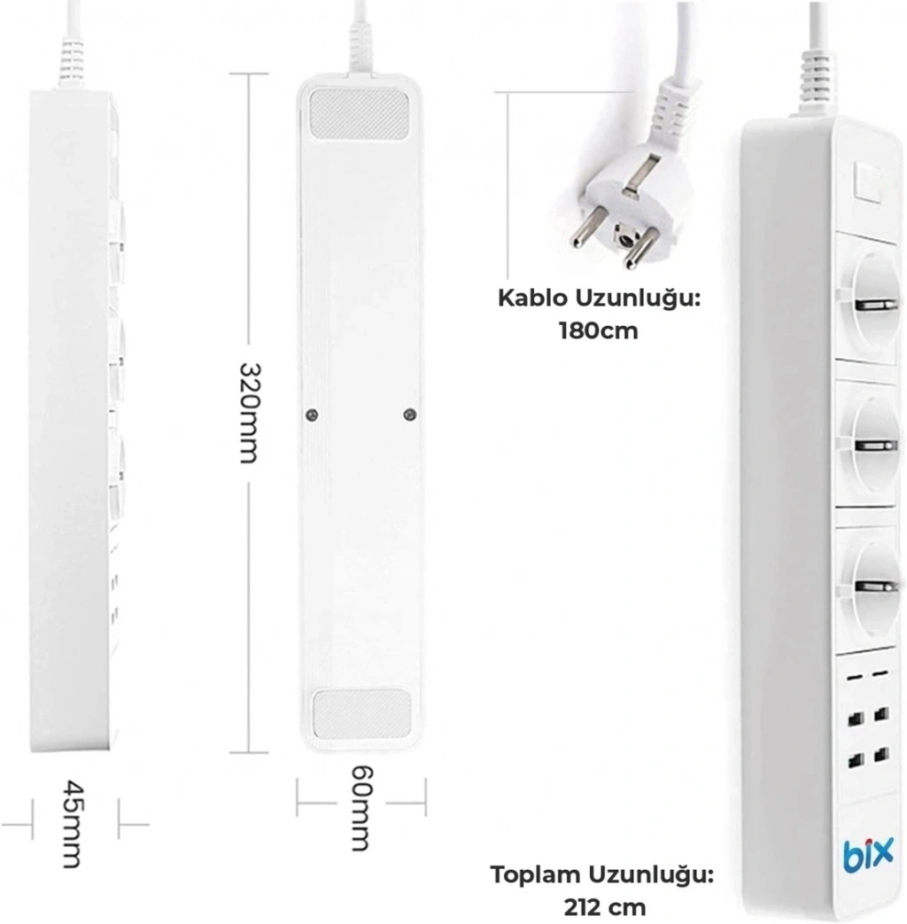 Termal Akım Korumalı, Çocuk Korumalı, 6’lı 2 Mt Uzatma Kablosu 6 X Priz, 3 X Usb