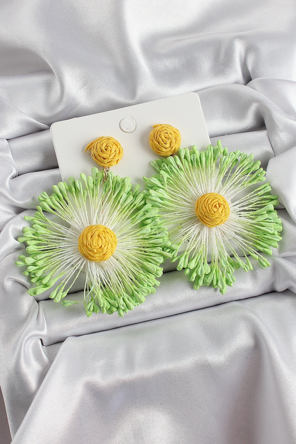 Yeşil Püsküllü Papatya Figürlü Hasır Örgü Model Gold Renk Kadın Küpe