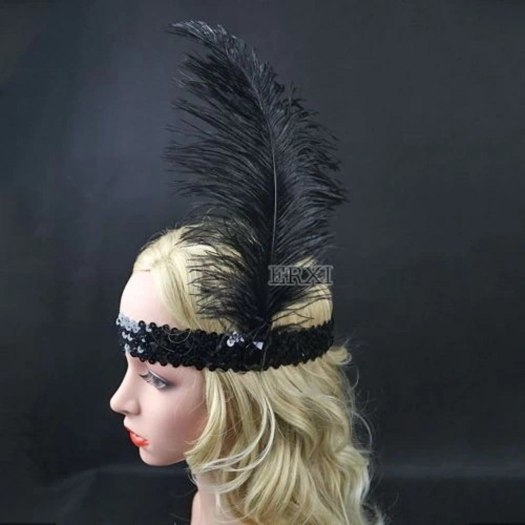 1920’ler Tarzı Siyah Tüylü Saç Bandı, Rugan Siyah Eldiven ve Siyah Otri̇ş Seti