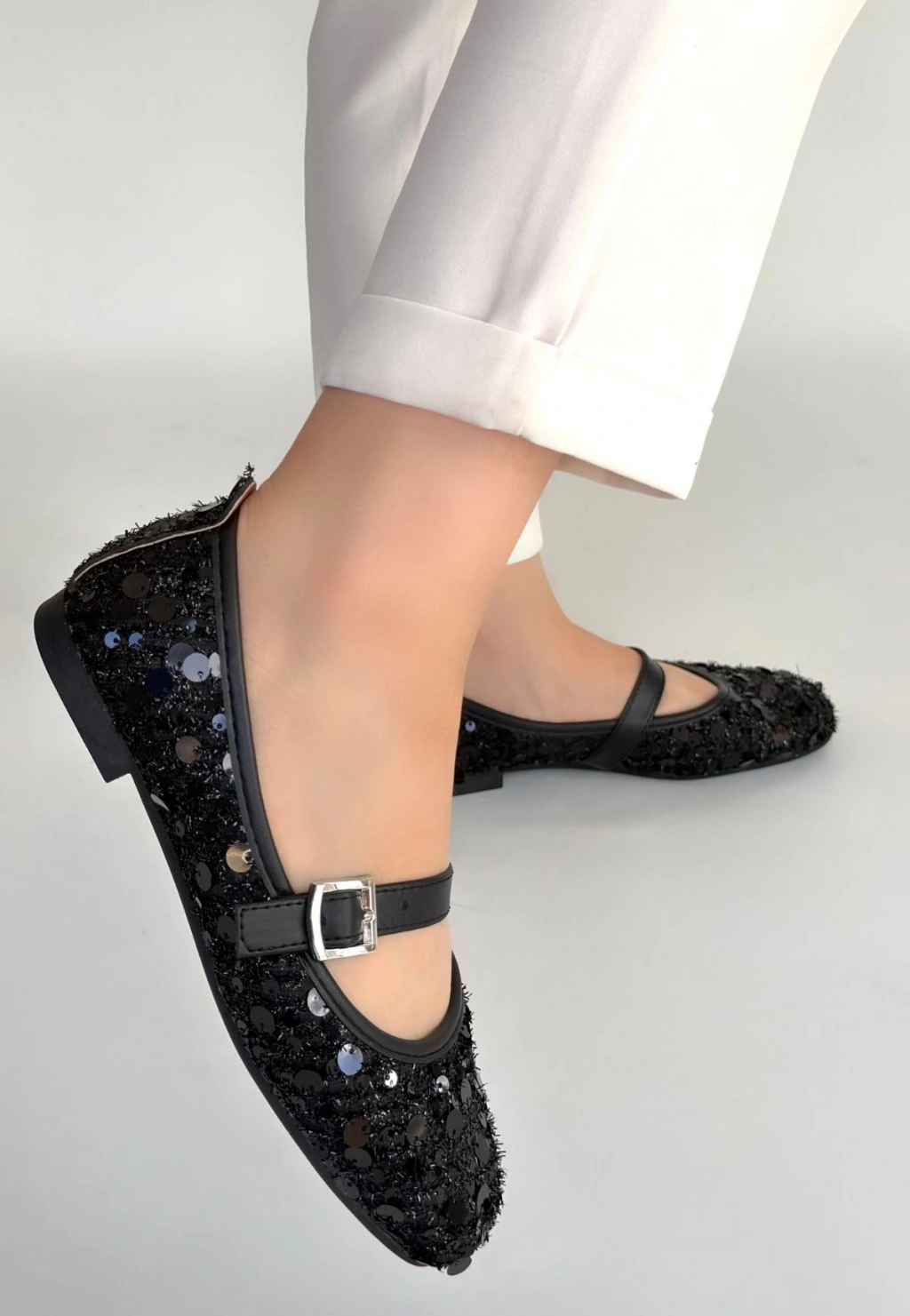 Zaty Siyah Süet Gümüş Pullu Babet Ayakkabı